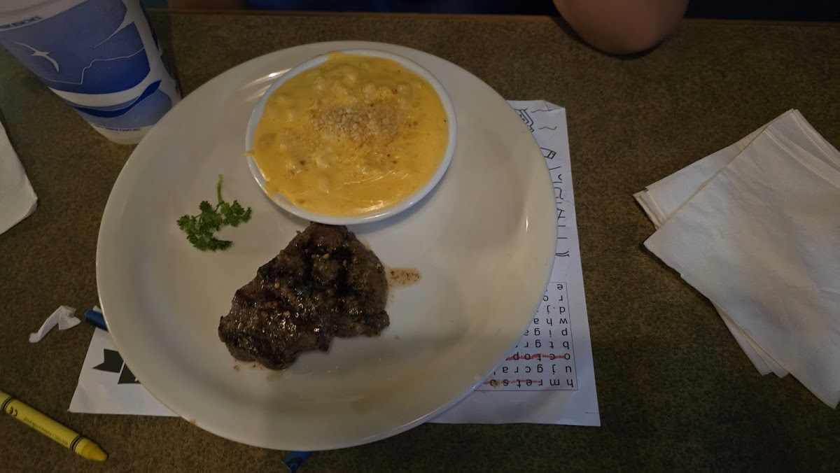 We stopped in for lunch and enjoyed a great meal. The filet mignon was excellent—tender and flavorful. The burger was large and tasty, definitely satisfying. The grilled chicken sandwich was also good. The kids’ mac and cheese was just okay—nothing special, but it worked for a quick bite. Overall, a solid lunch with a few standout dishes.